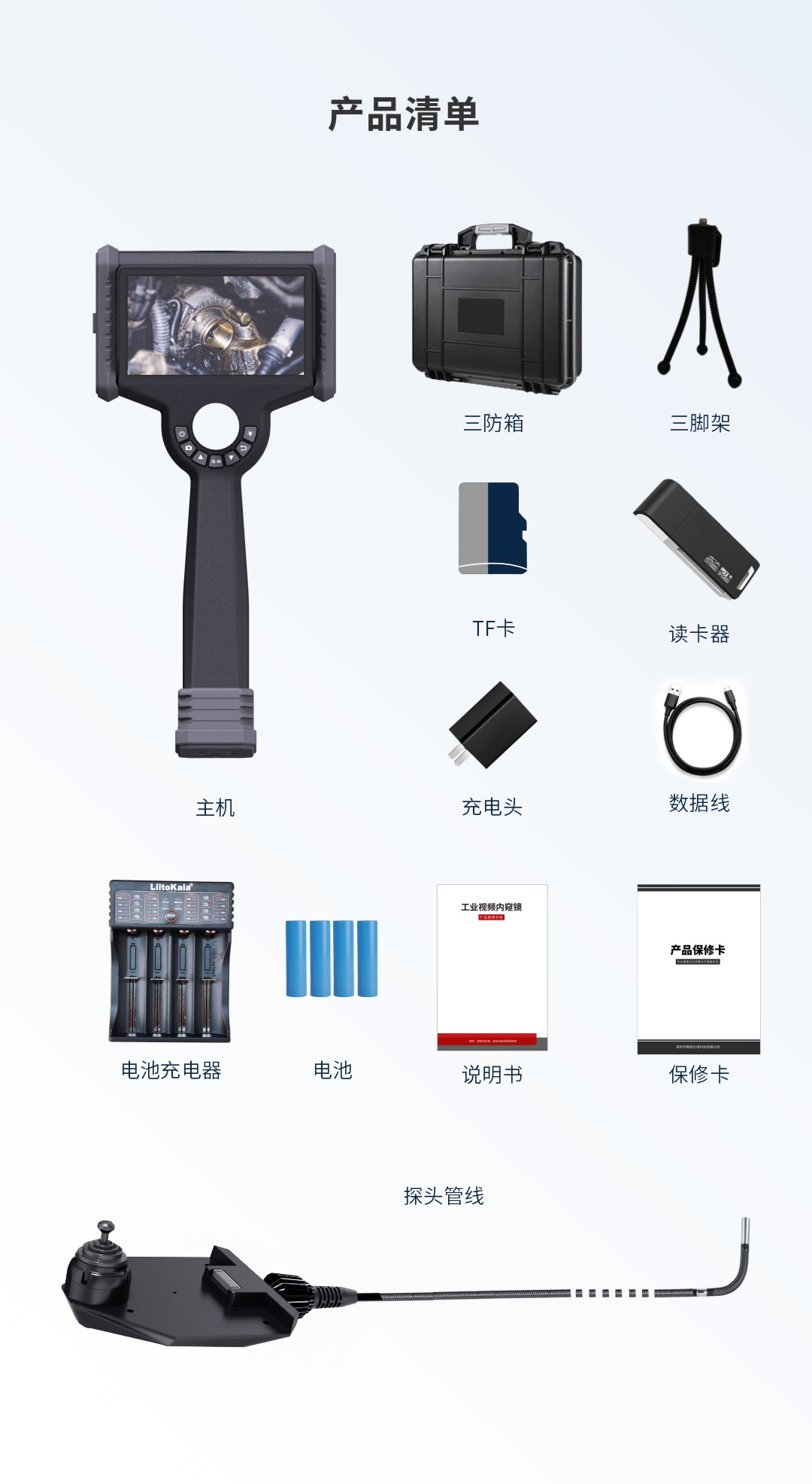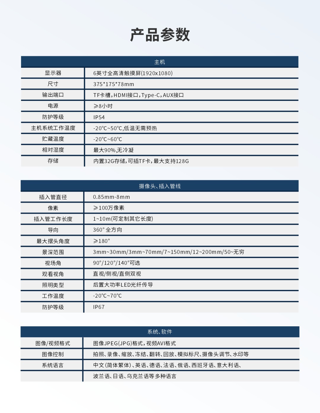 優(yōu)勢(shì)特點(diǎn):6英寸高清觸摸屏、快速更換管線、360°全方向擺頭、后置LED光纖導(dǎo)光、18650電池,工作時(shí)長(zhǎng)≥8